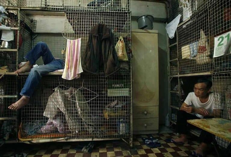 Hongkong, où les gens s’entassent dans des dortoirs où des cages font office d’appartement.